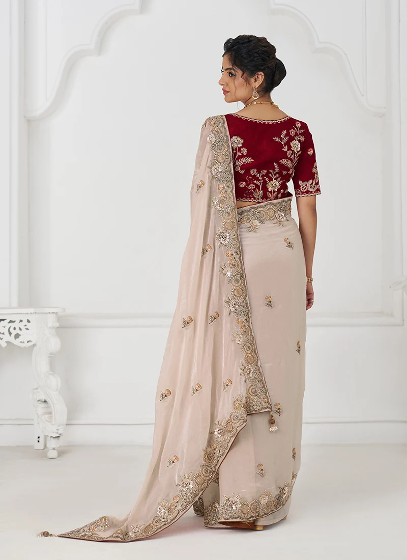 This beautiful beige saree is made from soft silk fabric. It has pretty golden thread, zari, and sequin embroidery with floral designs on the border and body. The saree comes with a rich maroon velvet blouse that has golden thread and sequin work, making it look very royal. This saree set is perfect for weddings, receptions, and special celebrations. Wear it with gold jewelry and simple makeup for an elegant look.