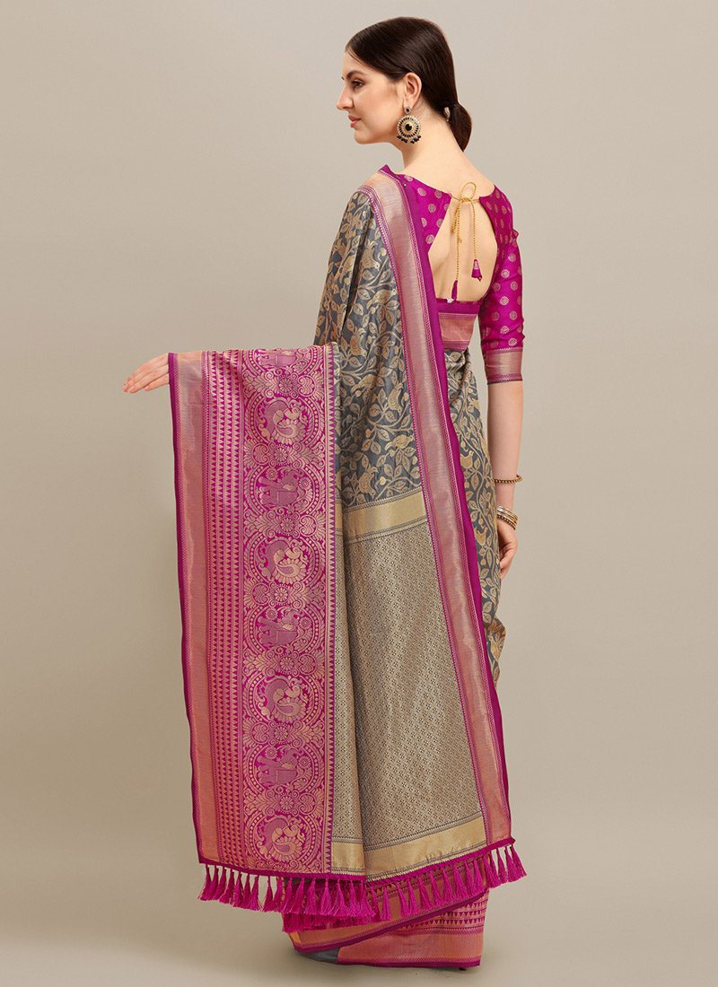 This beautiful Banarasi saree has a soft gray color with detailed gold zari floral and paisley designs. The bright pink border and pallu have traditional patterns and small tassels that add a royal touch. Made from fine silk fabric, this saree is great for weddings, festivals, and big celebrations. It mixes classic tradition with luxury, making you look elegant and graceful.