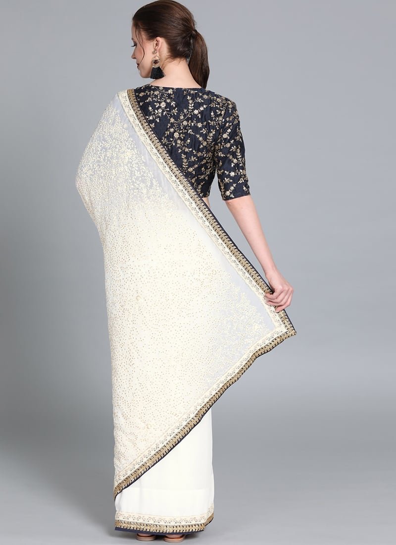 Graceful ivory and navy saree with intricate gold embroidery on the blouse and border, perfect for festive and formal occasions.